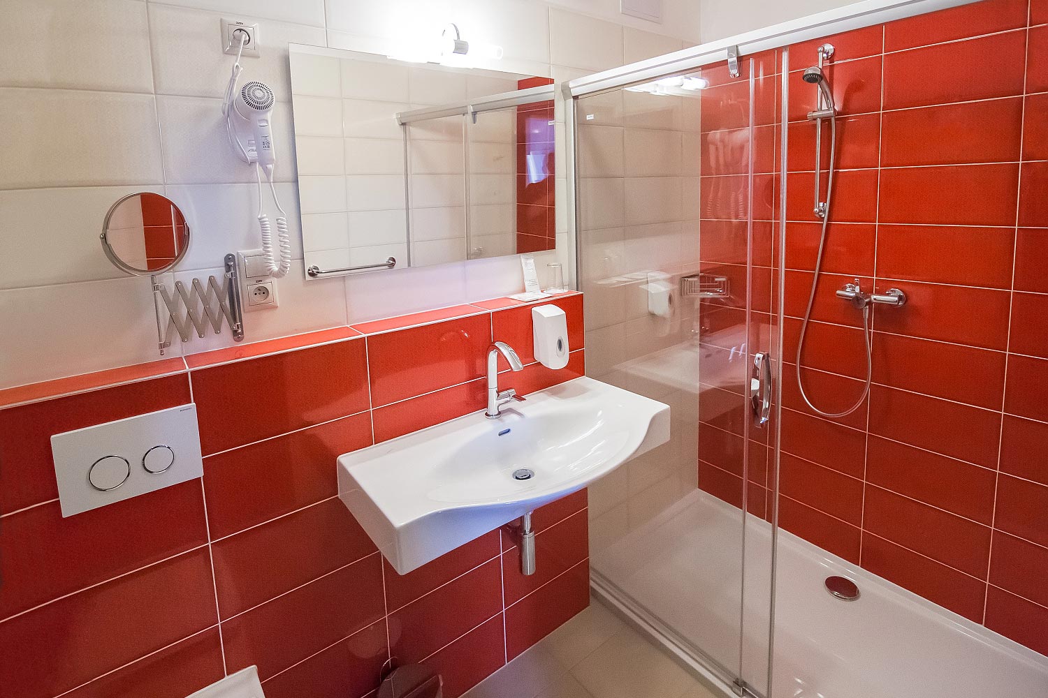 - separates Badezimmer mit Dusche oder Badewanne und WC, Leiterheizung, Haartrockner, Kosmetikspiegel